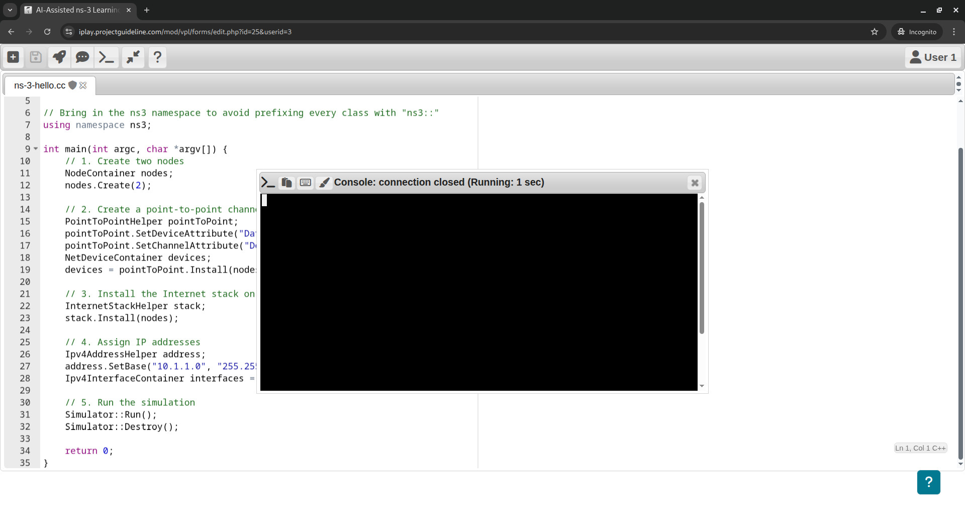 Here is a simple ns-3 script that creates a basic network with two nodes and a point-to-point link. This is a great "Hello World" equivalent for network simulation.